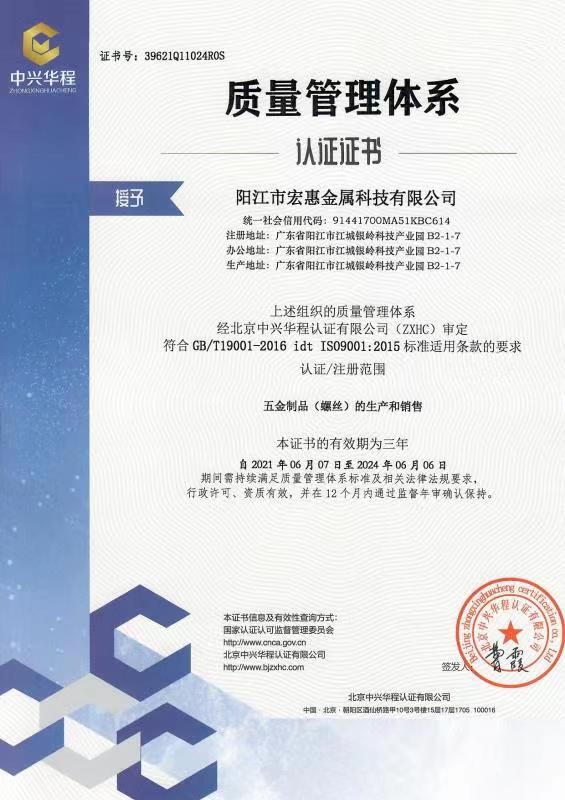 廣東宏惠金屬公司是家20多年一直專注鉆尾螺絲開發與生產的企業,是國內較早做鉆尾的廠家之一,同時也是國內專業開發生產鉆尾螺絲的企業之一。 我司地址為于廣東省陽江市江銀嶺科技園距沈海高速白沙出口不到2公里,距陽江高鐵站也只有十余公里交通便利。 公司占地120畝,擁有超500臺套專業設計 生產 檢測設備。一個超200人的專業團隊,能夠嚴格按照ISO9001質量體系要求生產符合GB DIN AS3566 ANSI JIS BS等標準的產品,生產銷售各種高品質緊固件系列產品,為中高端客戶提供優質服務。也可按照客戶要求設計生產各種鉆尾,年產高品質碳鋼 不銹鋼鉆尾螺絲2萬余噸.在各大客戶的鼎力支持下產品暢銷全國,并遠銷亞 非 拉 歐等地,在這20多年發展的道路上我司堅持“以質量求生存,以信譽求發展”的精神理念不斷完善公司體系。